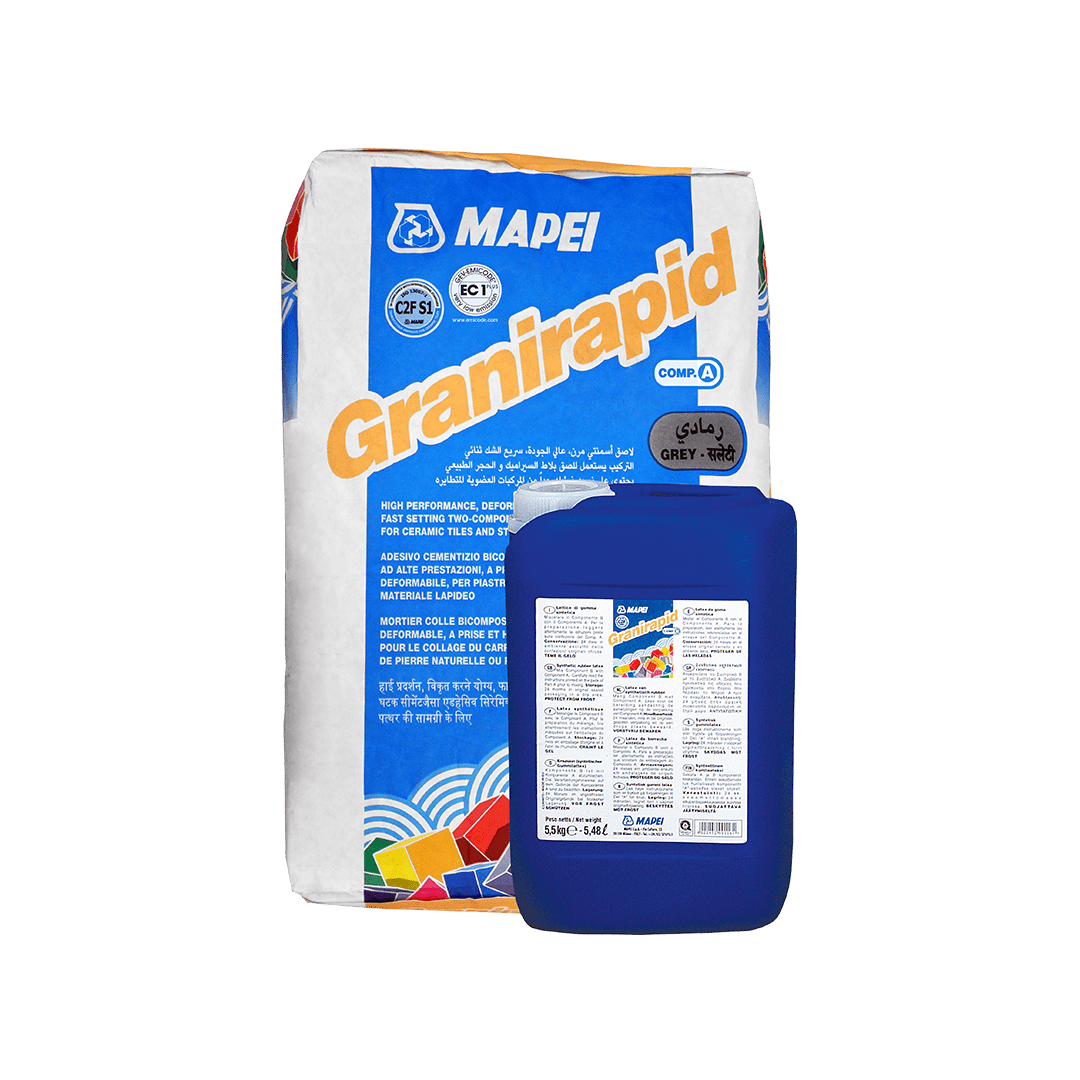 Because of its extraordinary bonding and fast-setting characteristics, Granirapid is particularly suitable for rapid re-tiling jobs or flooring that has to be ready for use within very short times (supermarkets, factories, malls, hospitals, airports, etc.).