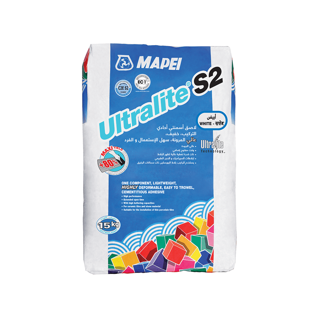 One-component, high-performance, highly-deformable, lightweight cementitious adhesive with extended open time, very high yield, easy to trowel and good buttering capacity, for ceramic tiles and stone, ideal for thin porcelain tiles.
